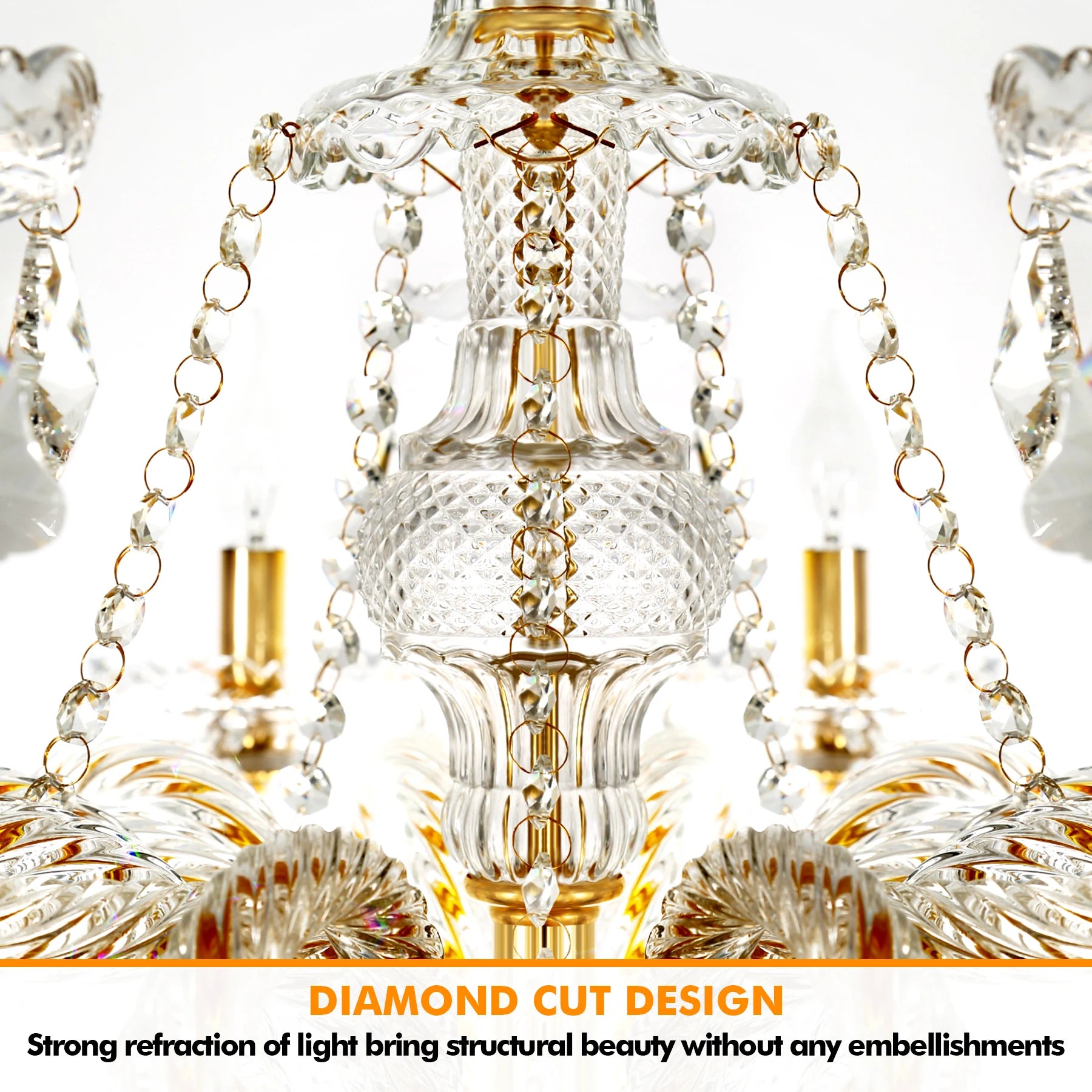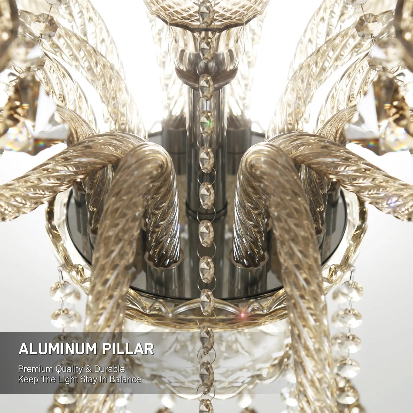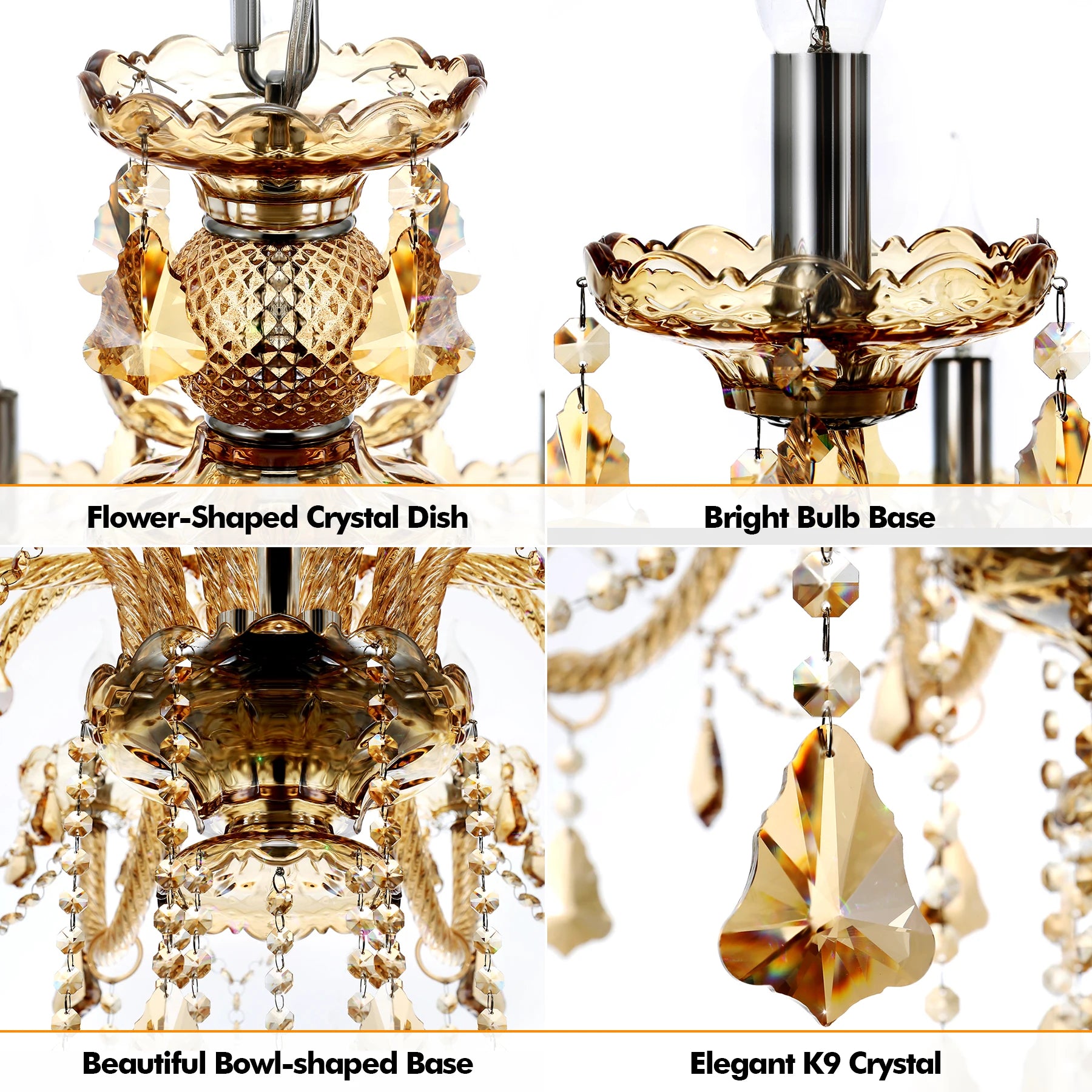 Crafted with premium K9 Crystal, this chandelier promises stunning clarity and sparkle, making it a perfect centerpiece for your living room, bedroom, or corridor. The polished chrome finish enhances its luxurious appeal, while the versatile color options—clear, cognac, amber, and gold—allow you to customize it to match your decor.