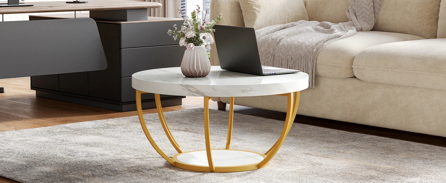 Enhance your living space with the 32-inch Circle Marble Coffee Table With Open Storage Gold Legs. Crafted for contemporary homes, this piece pairs a refined marble top with warm, inviting gold legs to create a versatile centerpiece that suits a range of décors.
