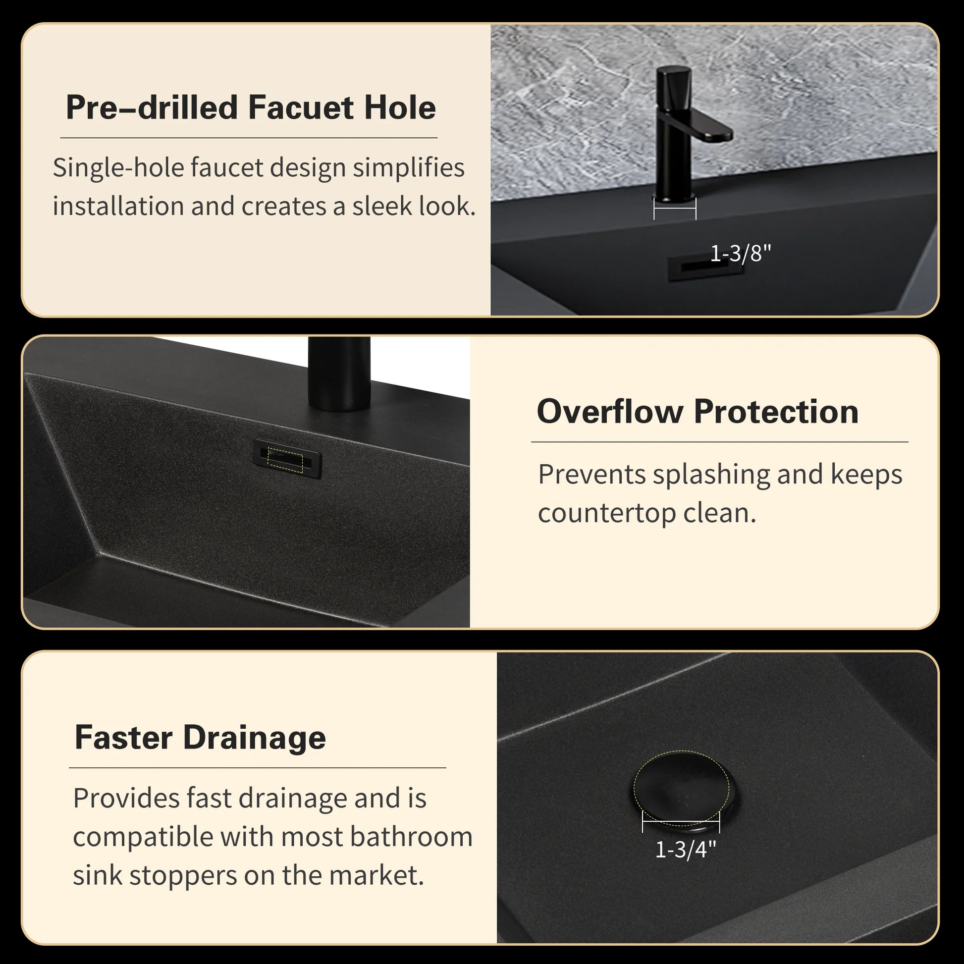 - Premium Black Quartz Top offers a durable, moisture-resistant surface with a contemporary, high-end finish.