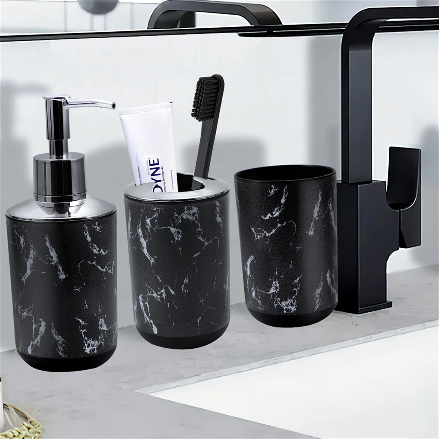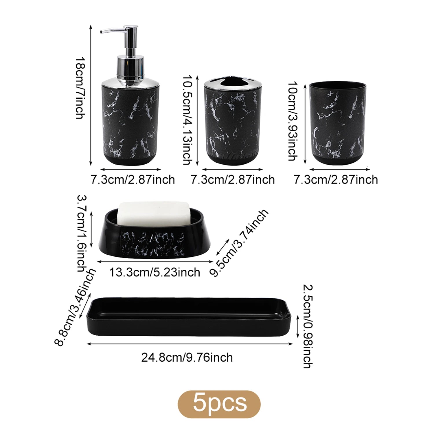 Elevate bathroom organization with the White Black Marble Bathroom Set, featuring a lotion bottle and a soap dish in a sophisticated marble pattern that complements contemporary décor.
