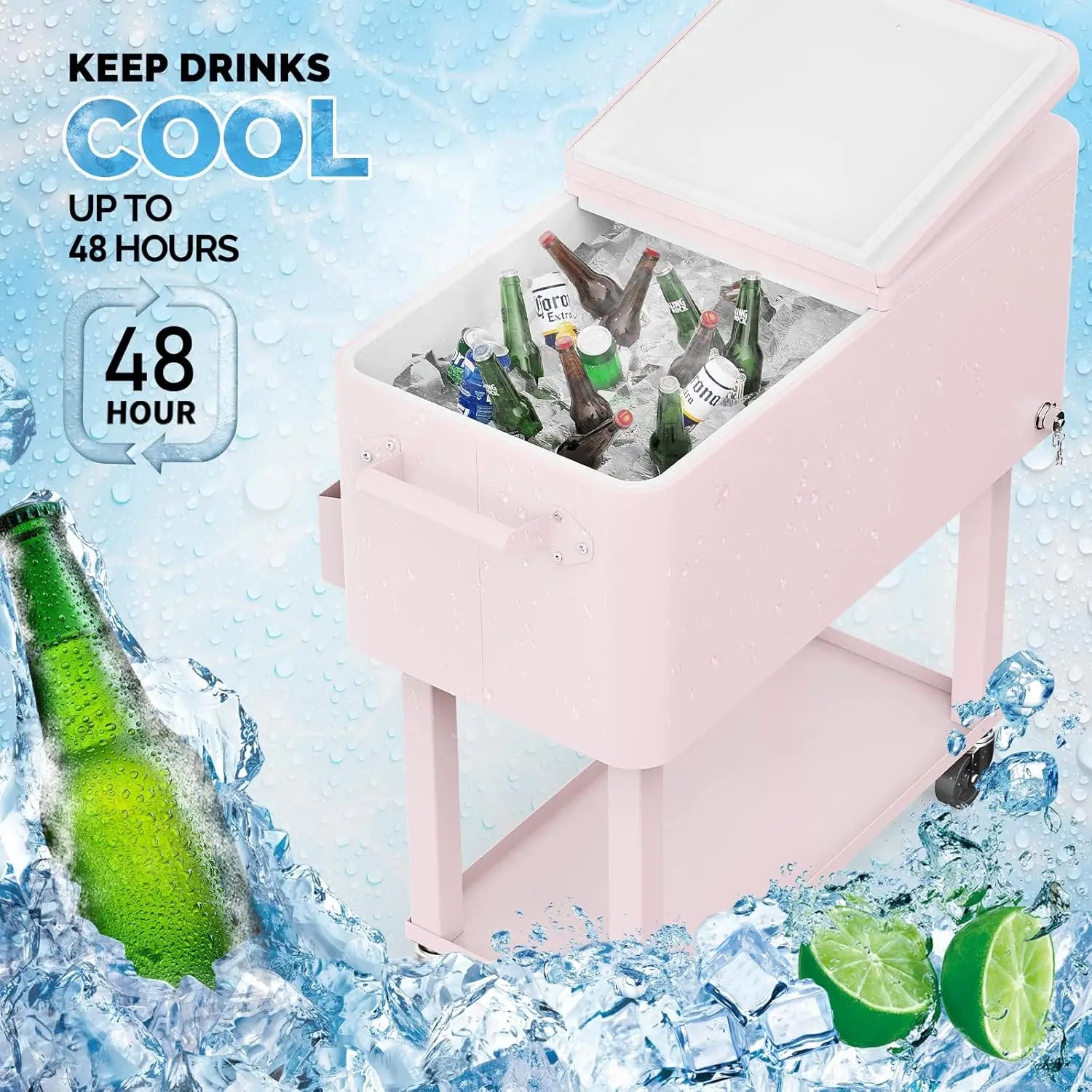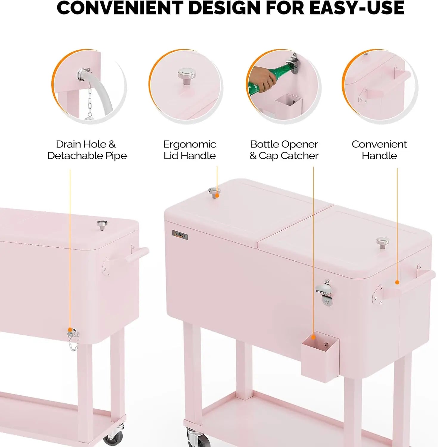 Elevate outdoor entertaining with the 80 Quart Rolling Ice Chest from XMSJBuckets. This portable patio party bar doubles as a sturdy drink cooler cart, designed to keep beverages cold and guests flowing smoothly. Crafted in pink iron, it combines durability with a playful accent that complements any poolside, patio, or backyard setting.