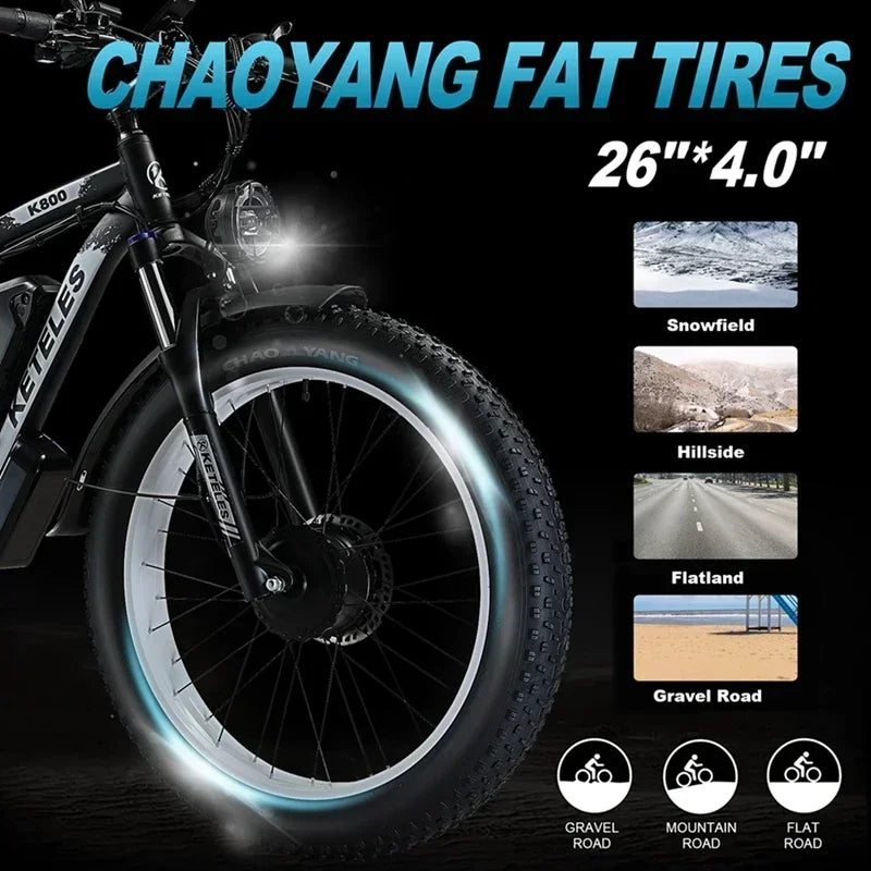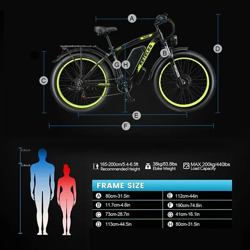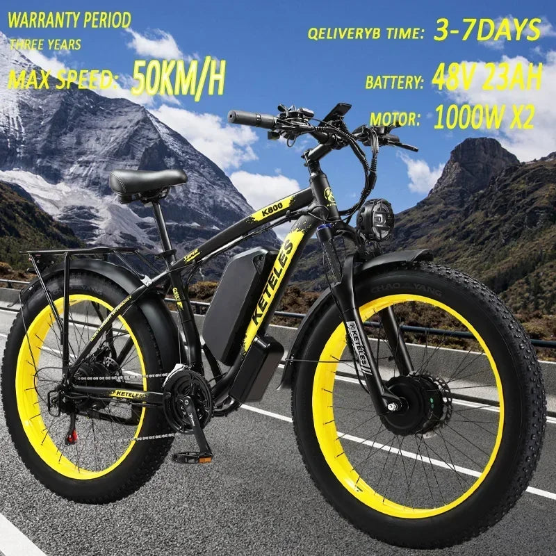 Experience the thrill of adventure with the Electric Bicycle KETELES K800, a powerful mountain off-road ebike that is designed for both performance and comfort. This stunning electric bike is equipped with a 2000W high power motor and a robust 48v 23ah lithium battery, providing you with the energy and speed you need to conquer any terrain.