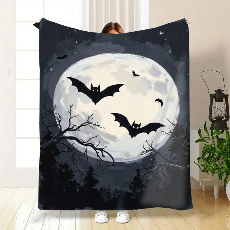 Flannel Blanket All Season Halloween Moon Bat Print – a cozy, year-round essential designed to add a playful Halloween vibe to any space.