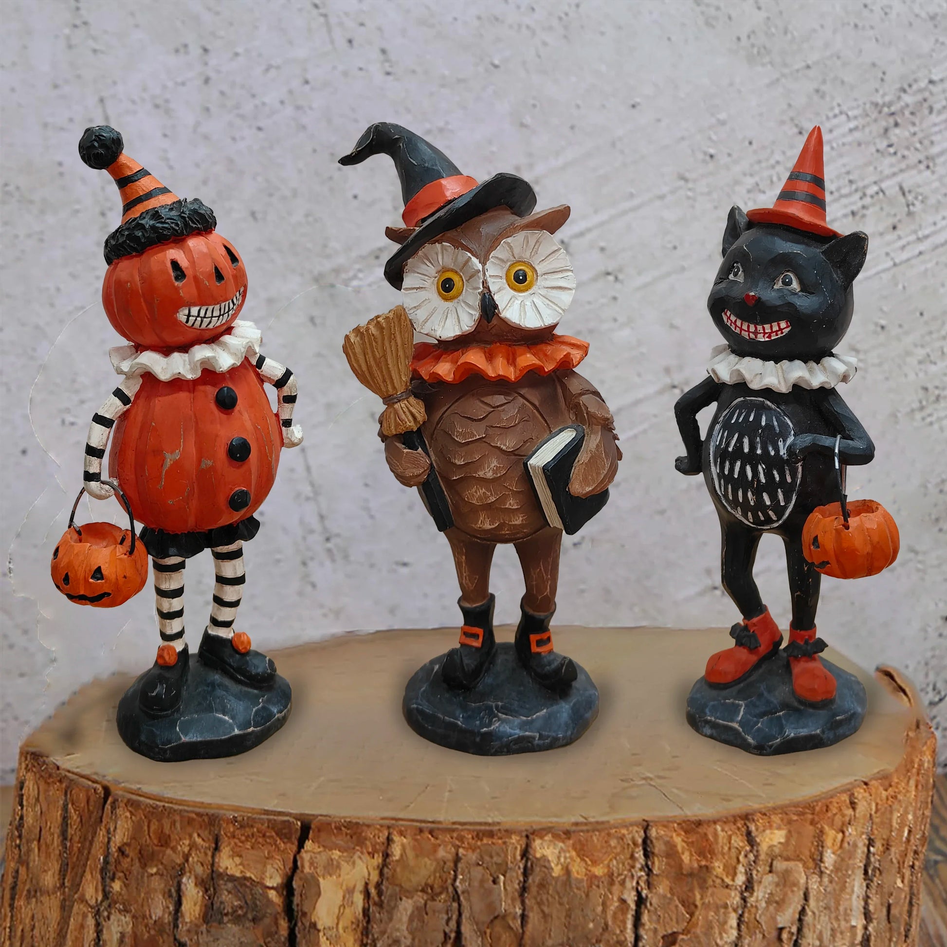 Made by Hign-concerned and crafted from resin, this statue pairs a classic pumpkin motif with owl and cat characters for a unique, eye-catching design. With no added chemicals, it’s built to stay bright and expressive through seasonal decor.