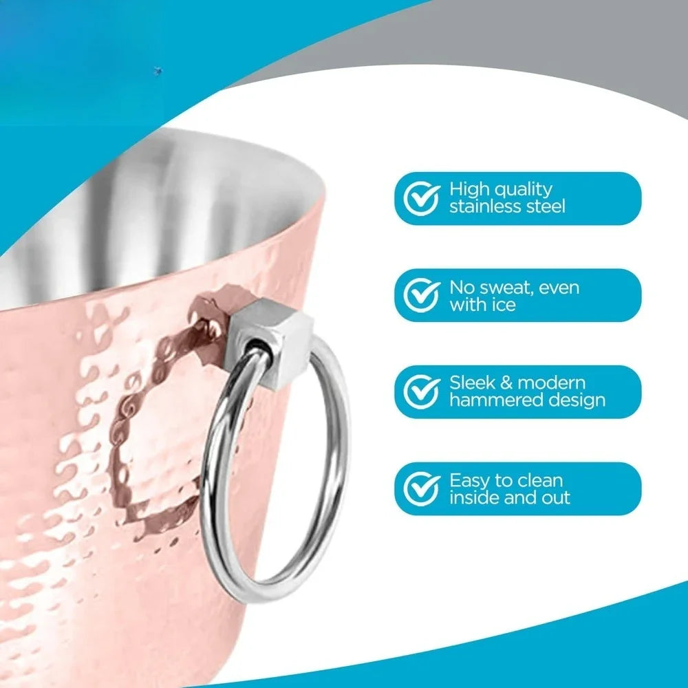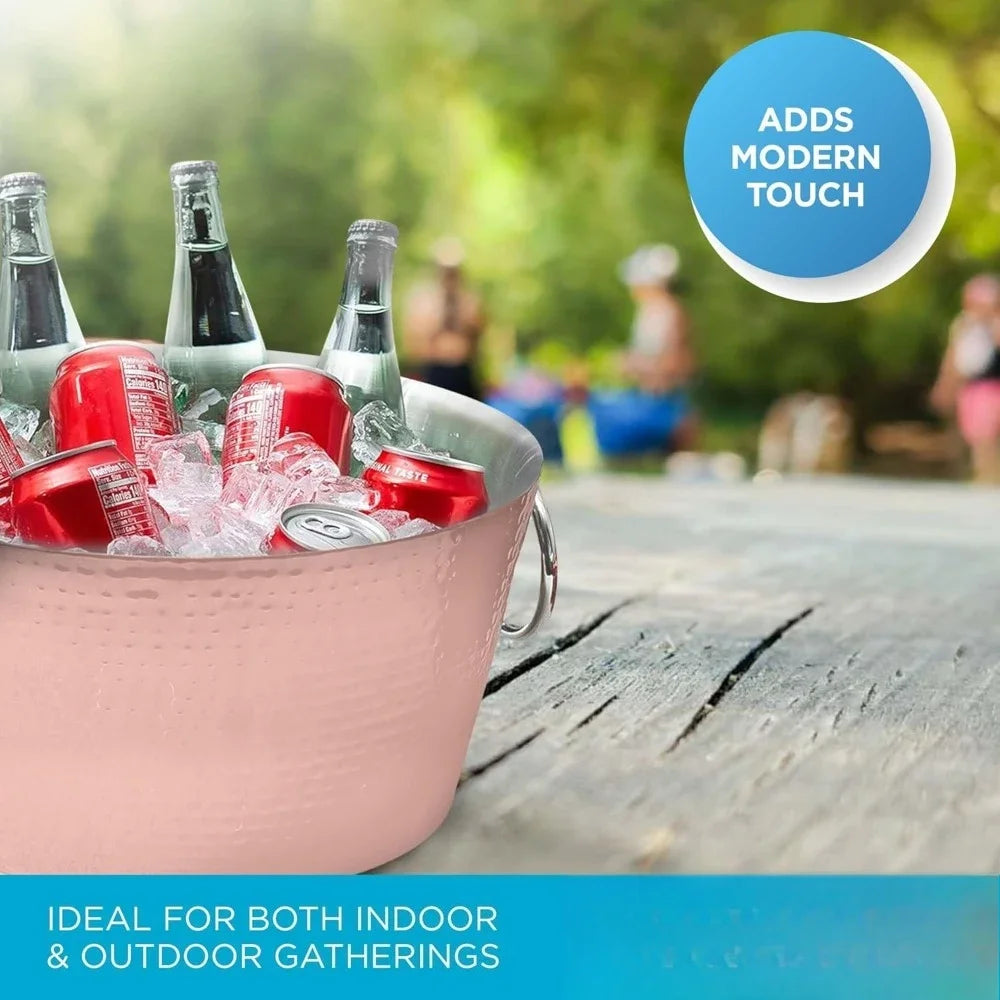 Elevate gatherings with the Hammered Stainless Steel Copper Beverage Tub with Handles from Comfy Cottage Shop. Built for performance and style, this double-wall insulated 3-gallon ice bucket keeps drinks cold longer and adds artisanal texture to any table or bar.