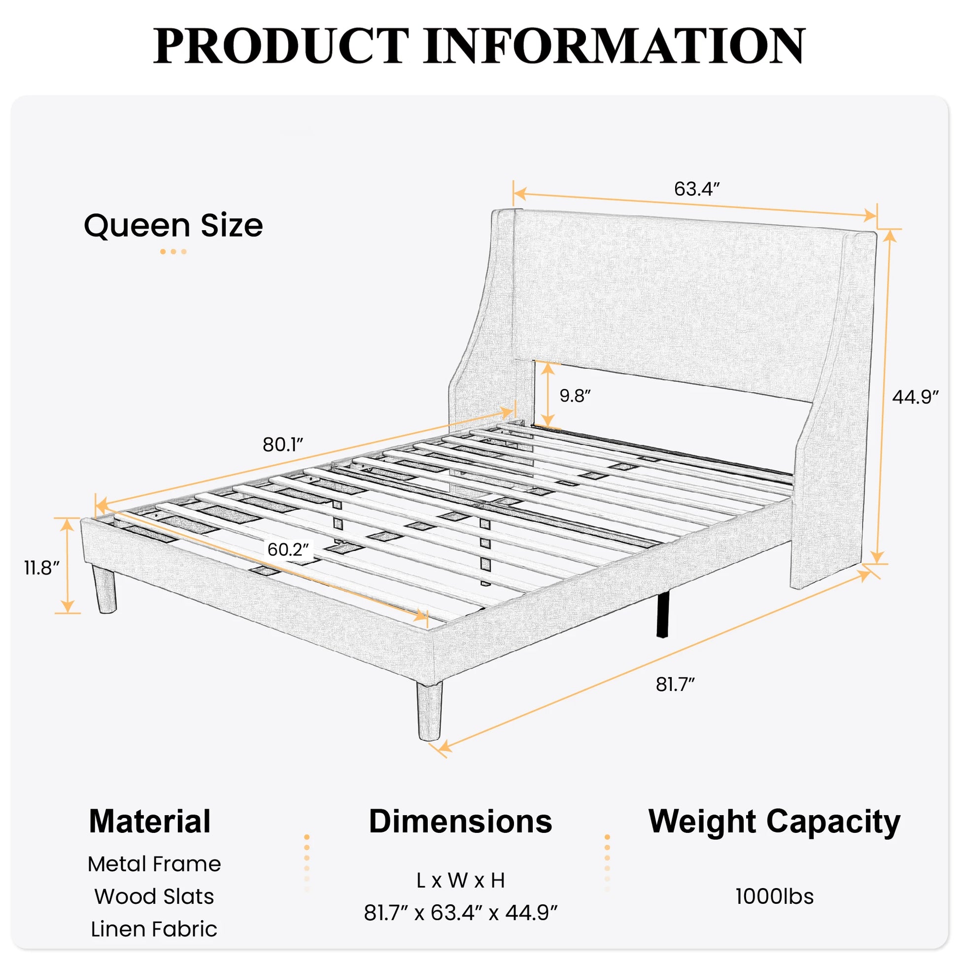 Designed for modern bedrooms, the bed frame invites you to unwind against a softly cushioned headboard while the platform design keeps your mattress perfectly supported. The wood slats create breathable ventilation for your mattress, promoting a longer life and consistent comfort night after night.