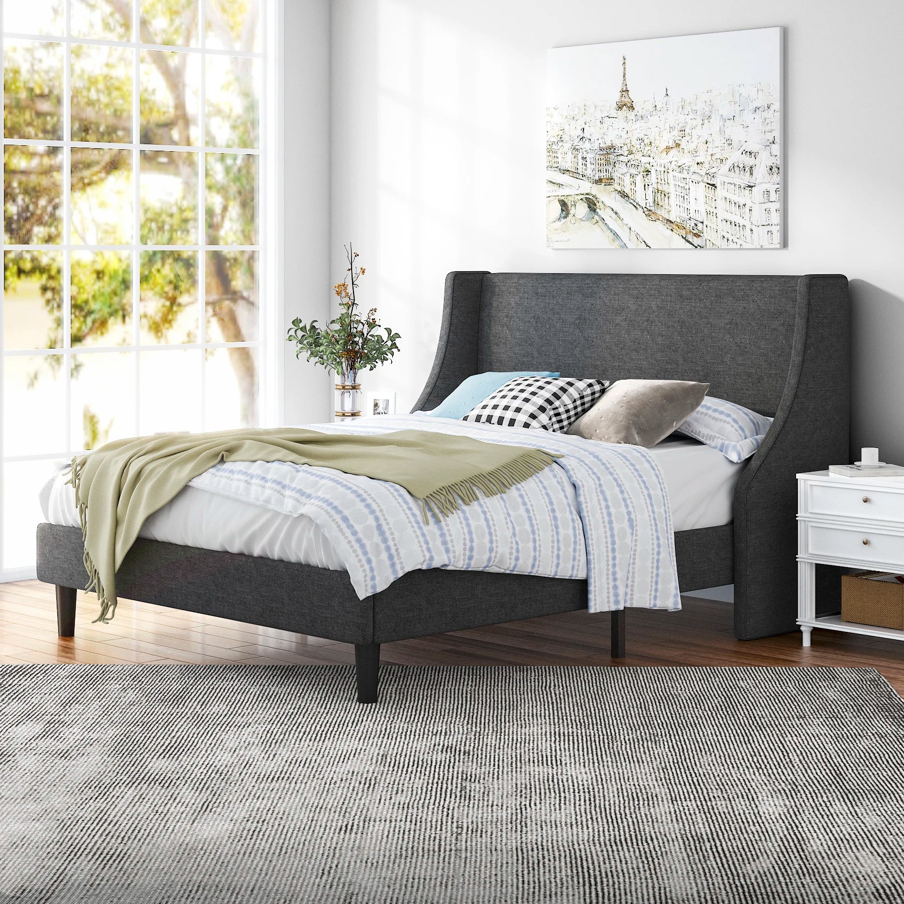 - Wingback upholstered headboard: A comfortable, stylish backrest that’s ideal for reading, watching TV, or mid-night pauses without piling on extra pillows.