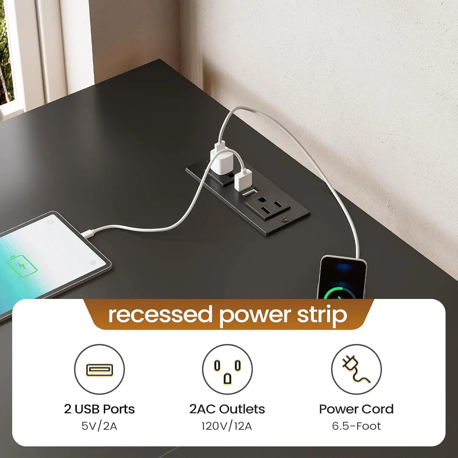 - Built-in outlet for convenient power access to laptop, lamp, and devices.