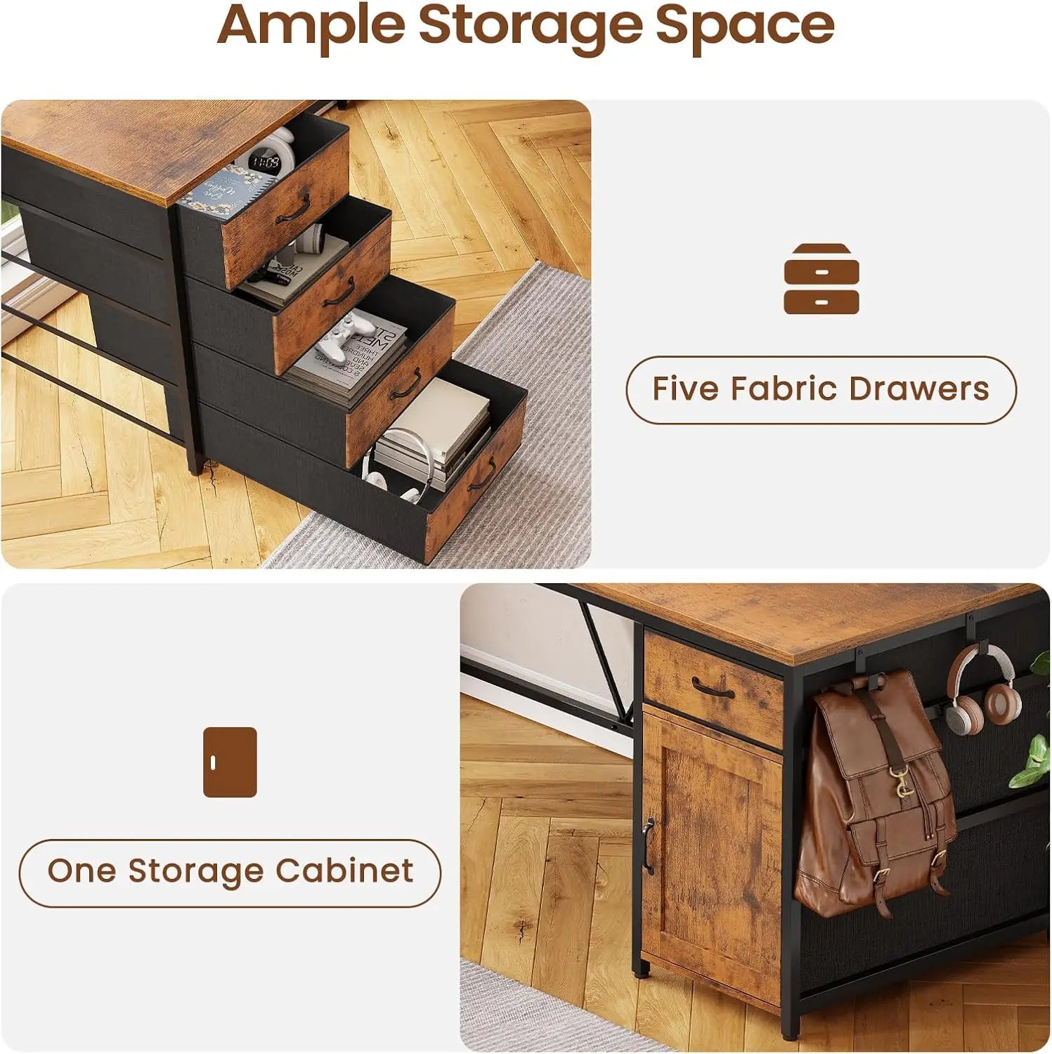 - Five integrated drawers: Ample closed storage to keep documents, supplies, and cables tucked away, so your desk stays clean and focused.