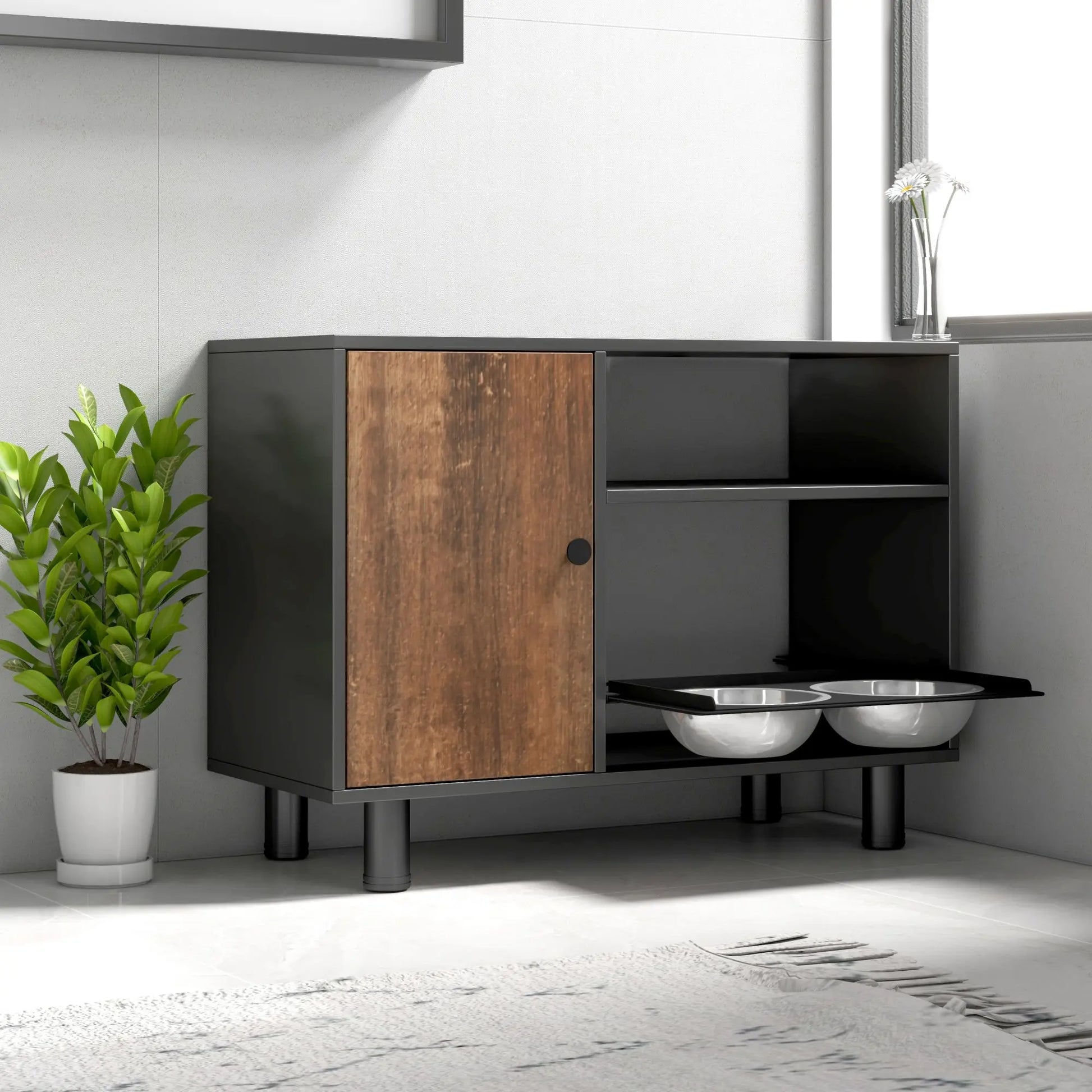 Use cases and benefits in everyday life — perfect for apartments, kitchens, or hallways where space is at a premium. The elevated design reduces clutter on the floor, and the dual bowls provide a stable feeding setup that’s easy to access for you and your dog. The storage cabinet keeps kibble within reach yet neatly contained, helping to preserve freshness and reduce odors.