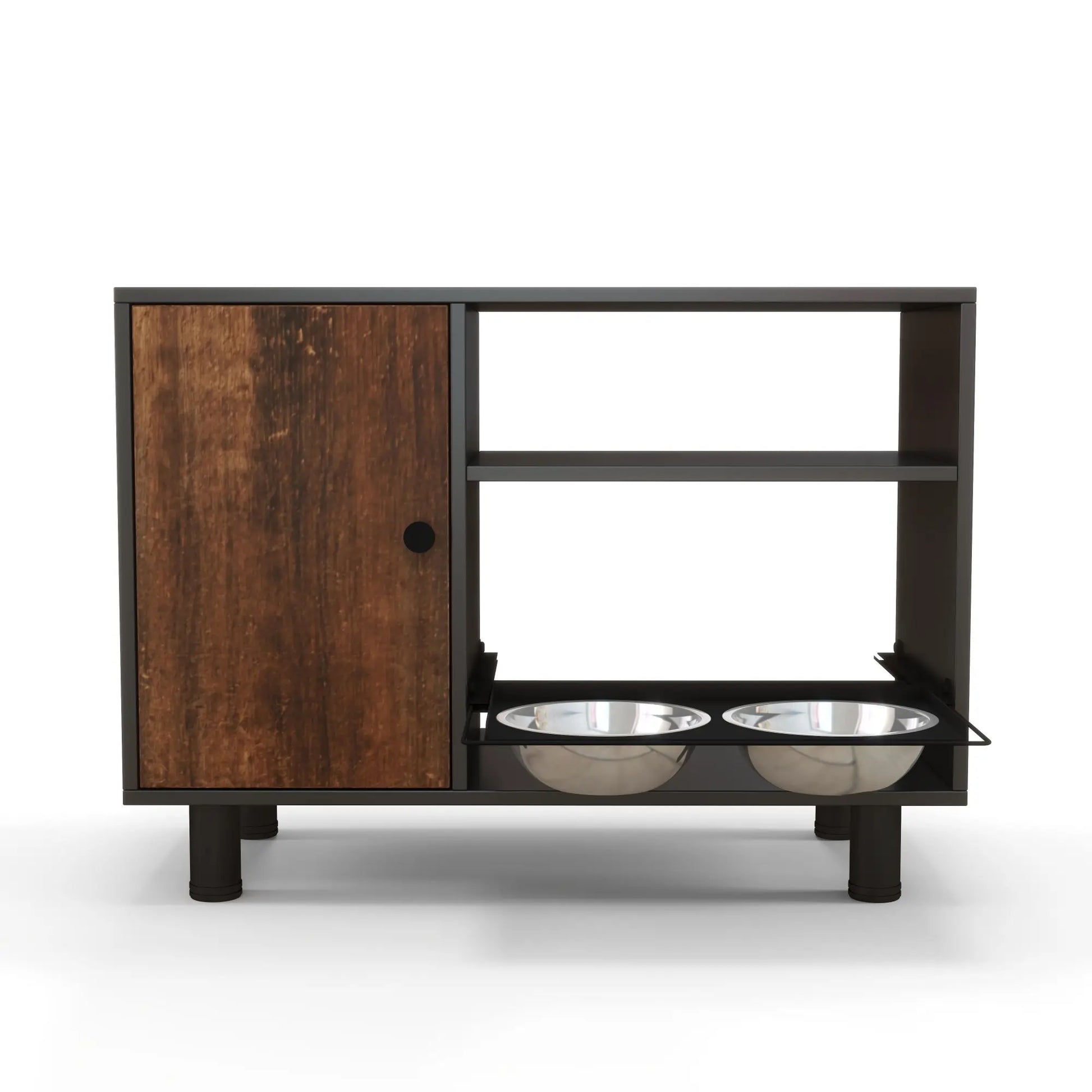 All-in-one design with built-in storage — a sturdy wood table plus a dedicated cabinet provides a convenient home for kibble, treats, and feeding accessories. No more chasing bags and bowls around the kitchen. Everything you need for mealtime is neatly tucked away in one durable, accessible spot.