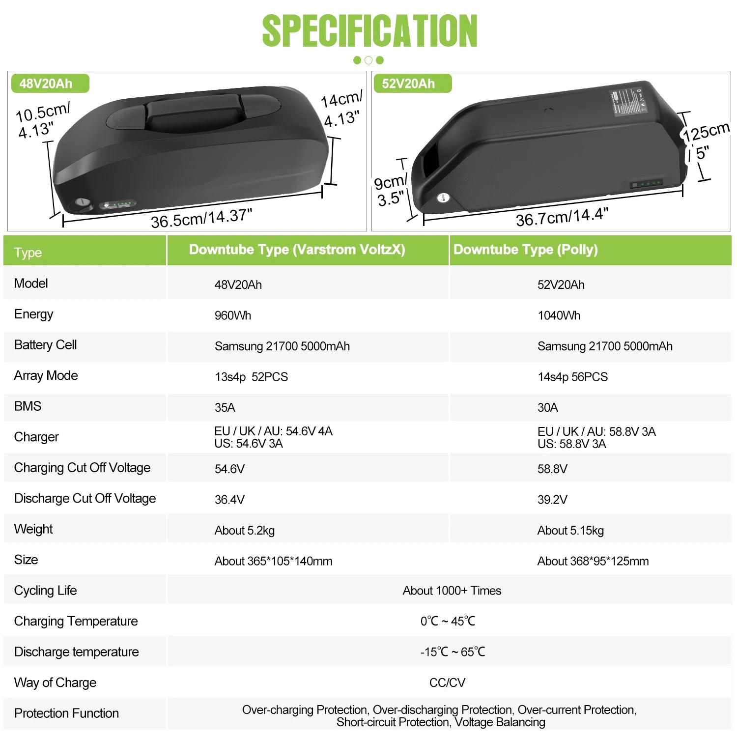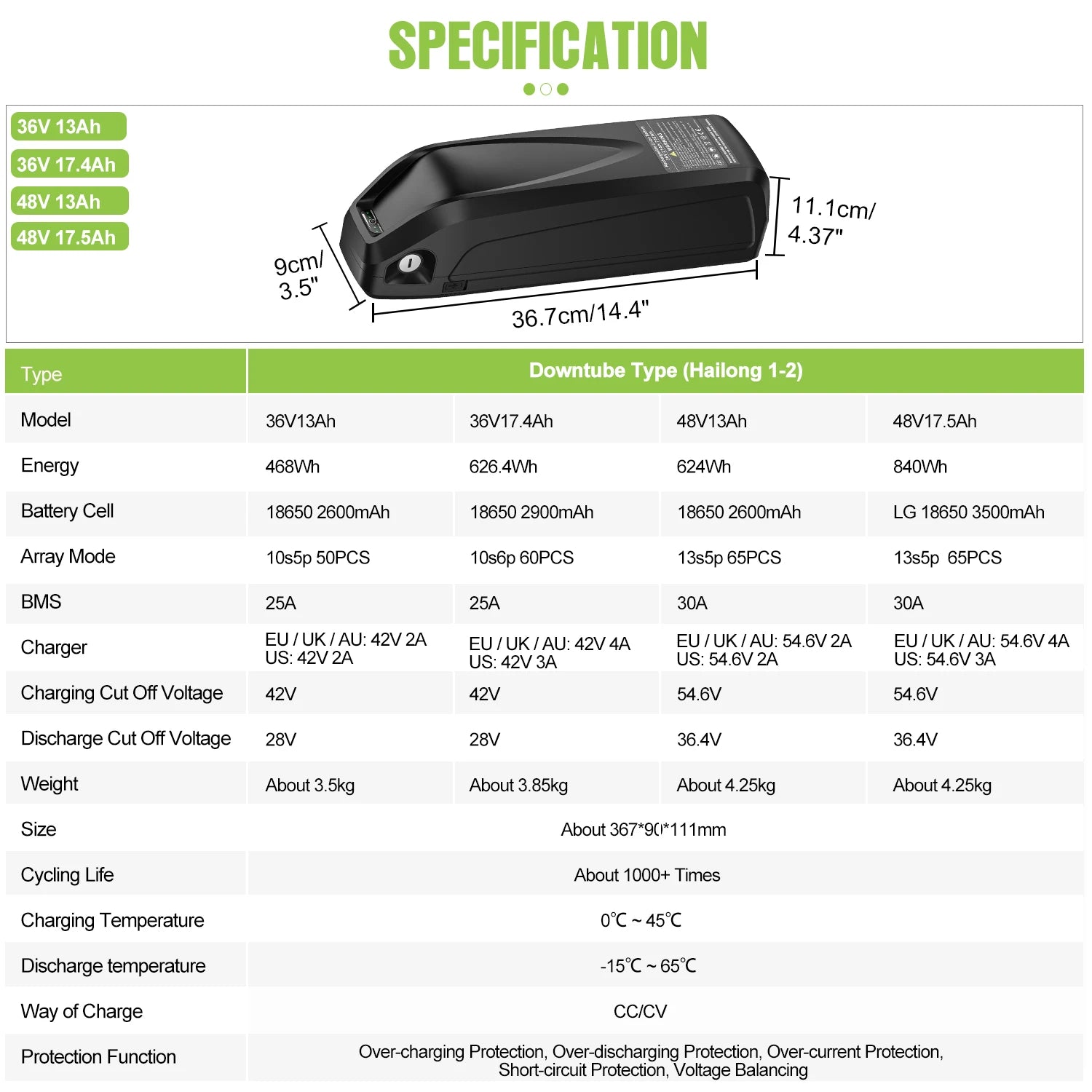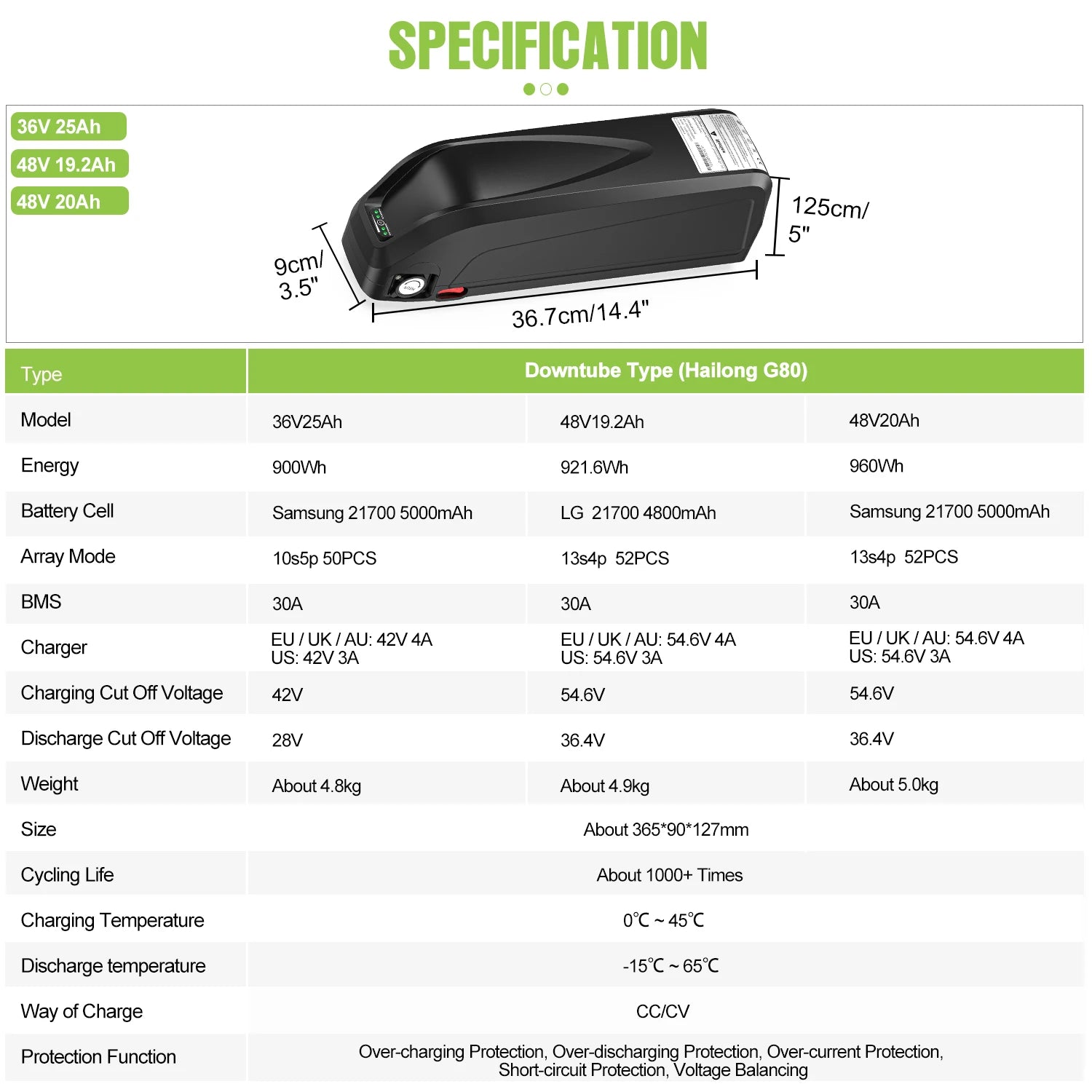 - Capacity: 21–30Ah (≈1.0–1.44 kWh)