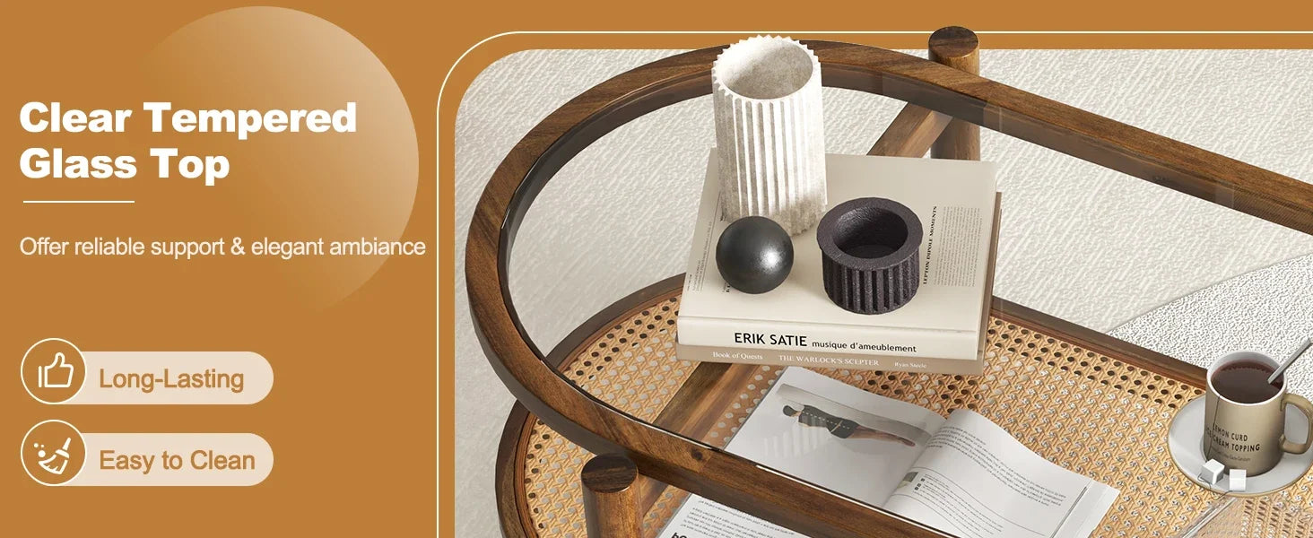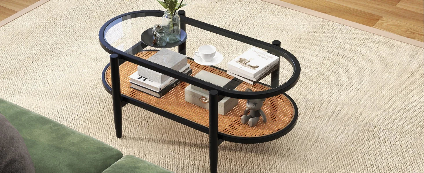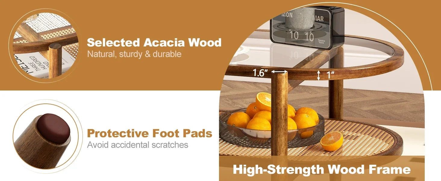 Elevate your living space with the Rattan Coffee Table 2 Tier Acacia Wood With Glass Top Shelf, a stylish centerpiece from Comfy Cottage Shop.