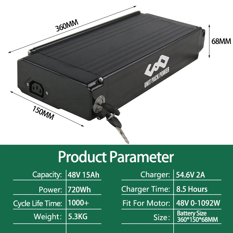 Rear Rack Battery 36V15Ah 48V15Ah 52V20Ah 24 26 28 Inches