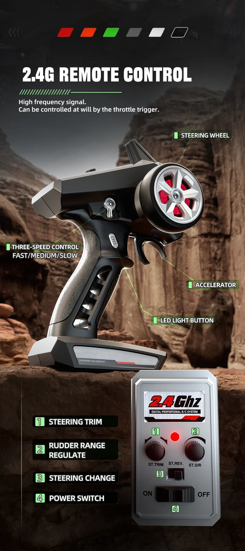 - Controller: MODE2 handheld radio for intuitive steering and throttle control