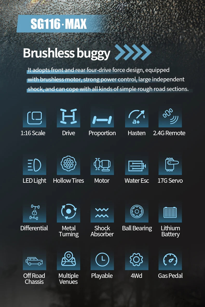 Meet the SG116 MAX 1:16 High Speed Drift RC Car – a 4WD brushless off-road monster built for speed, power, and precision drifting. This ready-to-go chassis blends a rugged metal-and-plastic construction with advanced brushless performance to dominate dirt, gravel, and pavement with ease.