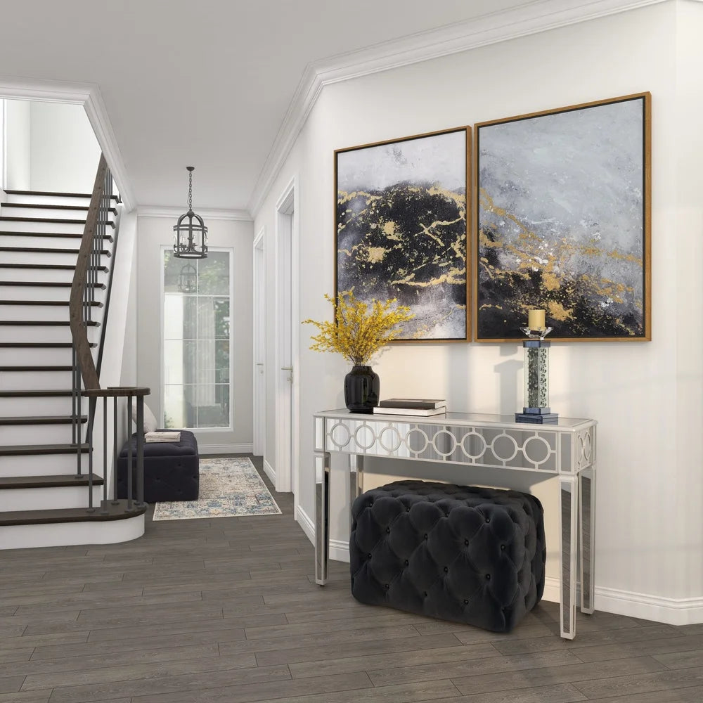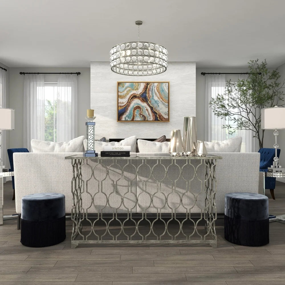Designed in a modern style and crafted from glass, the stand features floating crystals that shimmer as light plays across the surface. The sleek silver finish adds sophistication while remaining versatile for a variety of room schemes.