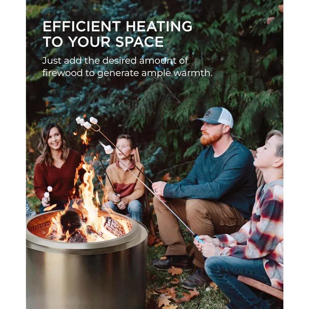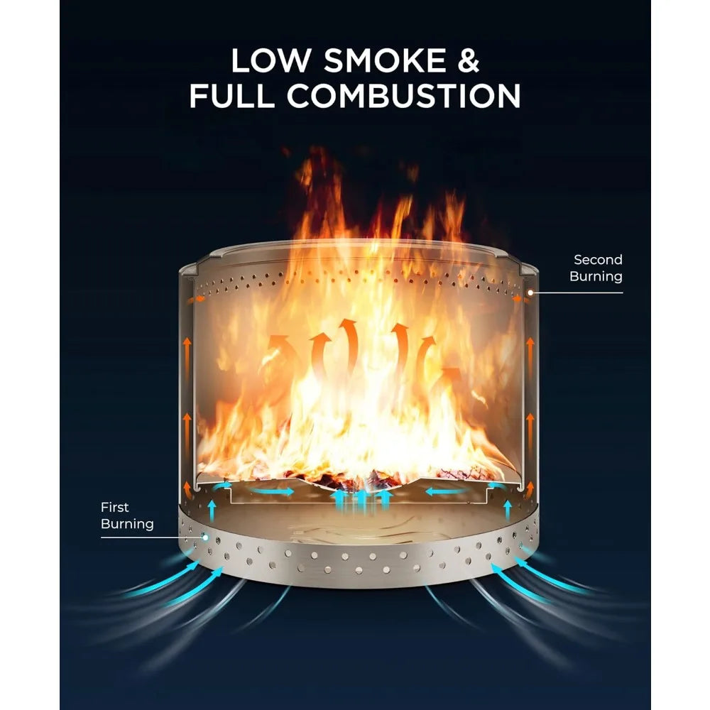 Enjoy the warmth of a wood-burning fire with less smoke. The Smokeless Fire Pit, a 19.7-inch round model, is designed for outdoor spaces like patios, decks, and backyards. Its polished stainless steel construction offers a sleek, modern look that complements any outdoor setting.