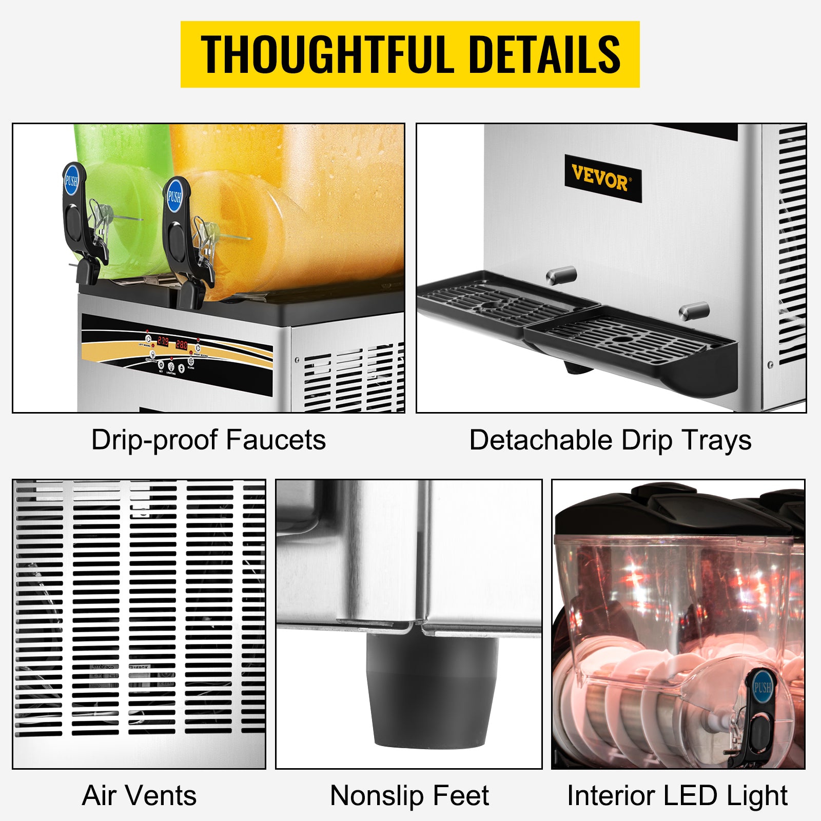 Elevate your beverage offerings with the SucceBuy 2x15L Commercial Slushy Machine, the ultimate margarita maker designed for supermarkets and commercial use! This powerful 1000W machine combines efficiency and style, ensuring that your customers enjoy perfectly frozen drinks every time.
