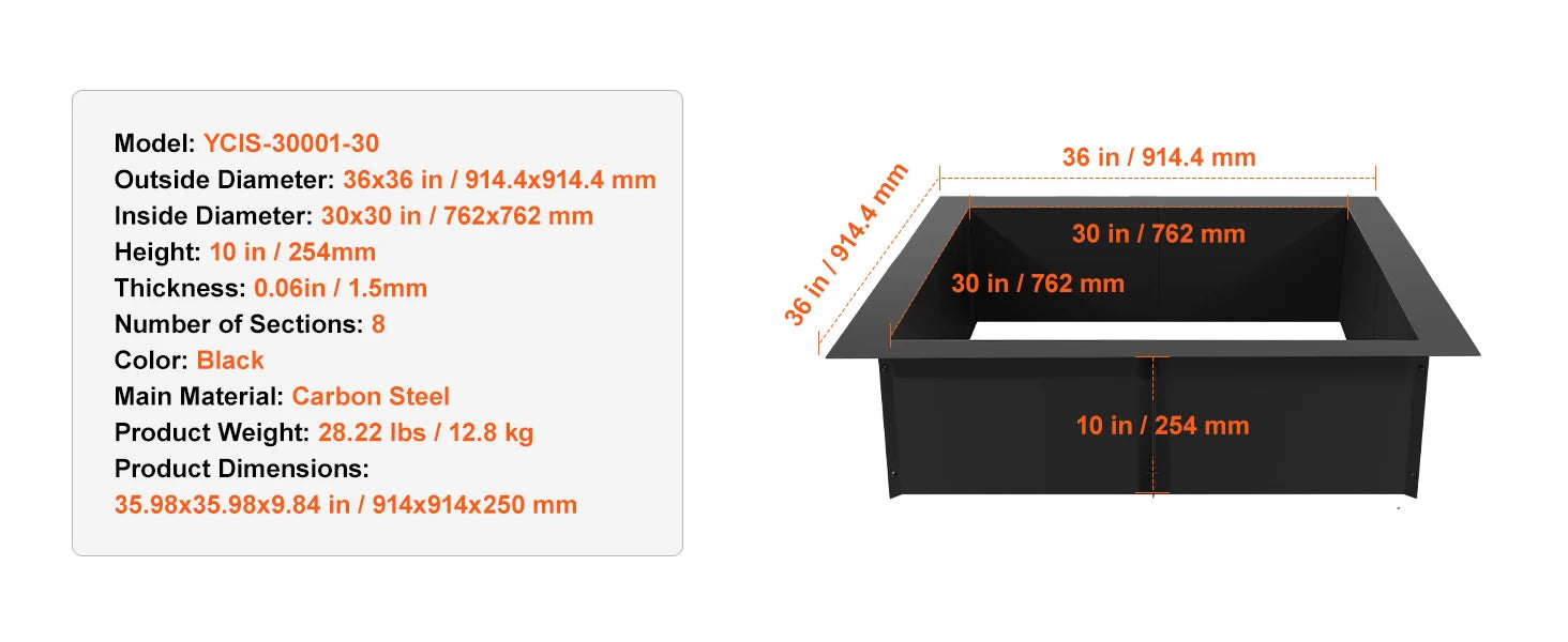 SucceBuy Fire Pit Ring 36x36 Outer 30x30 Inner Height 10in