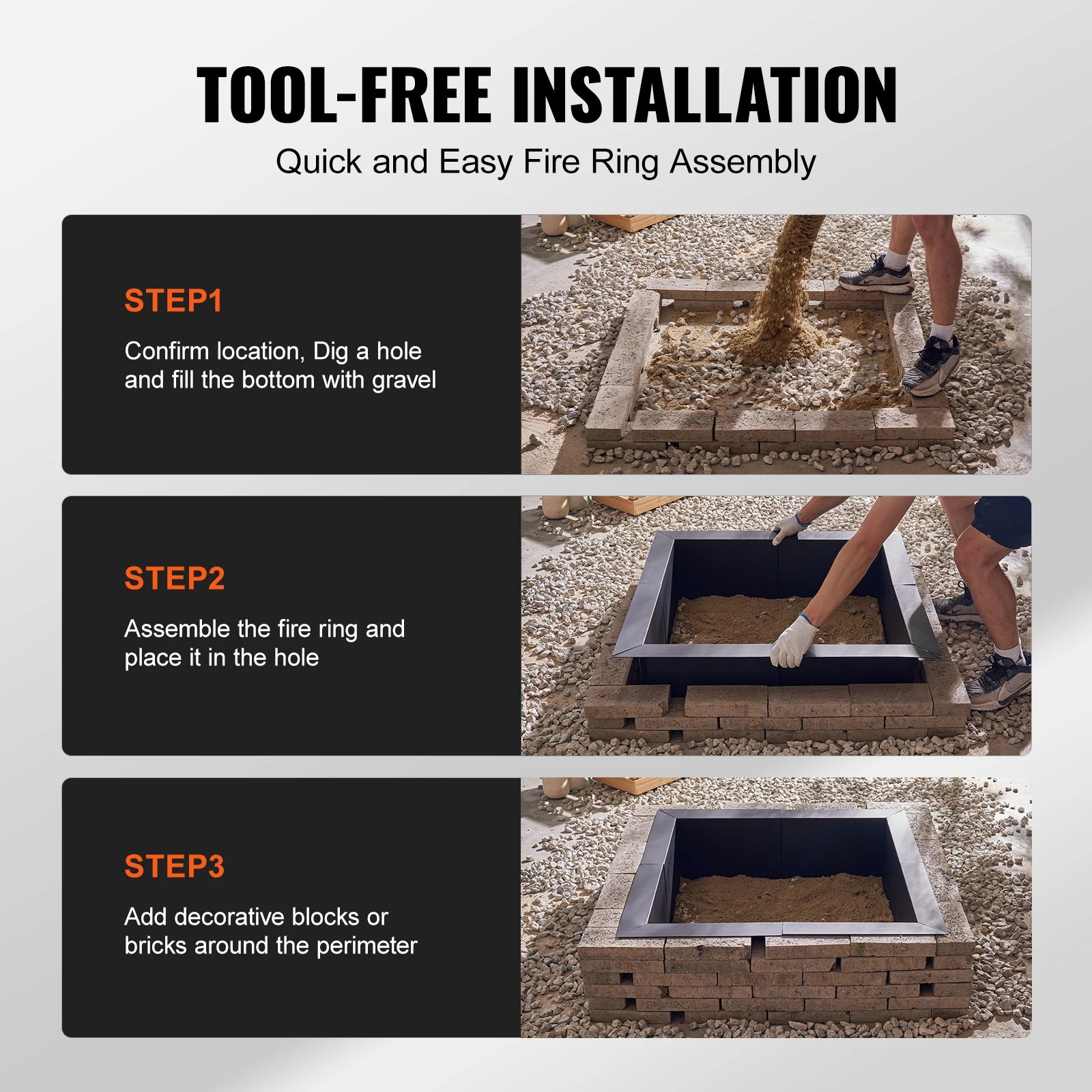 Ignite cozy outdoor fires with the SucceBuy Fire Pit Ring, a square insert designed to elevate safety and style for outdoor camping bonfires. This sturdy ring features a 36 x 36 inch outer frame and a 30 x 30 inch inner opening, delivering a focused burn zone with a clean, finished look.