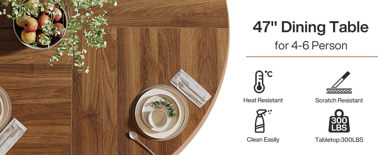- 47-inch round tabletop — seats up to 6 for family dinners or casual entertaining.