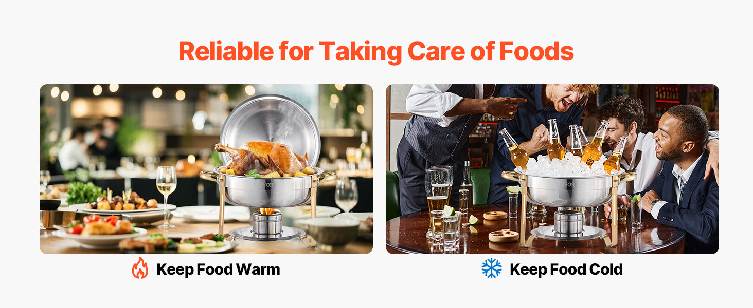 Crafted from high-quality stainless steel, these chafing dishes are not only durable but also add a touch of elegance to your food presentation. The round design enhances the visual appeal while ensuring even heating, keeping your dishes warm and ready to serve.