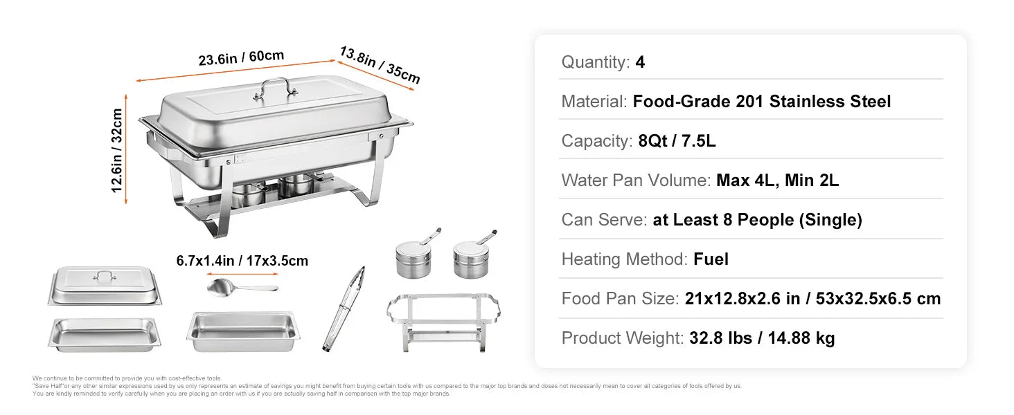 Vevor 8QT Rectangle Chafing Dish Set 4 Pack Stainless Steel Buffet Server Food Warmer Catering Equipment