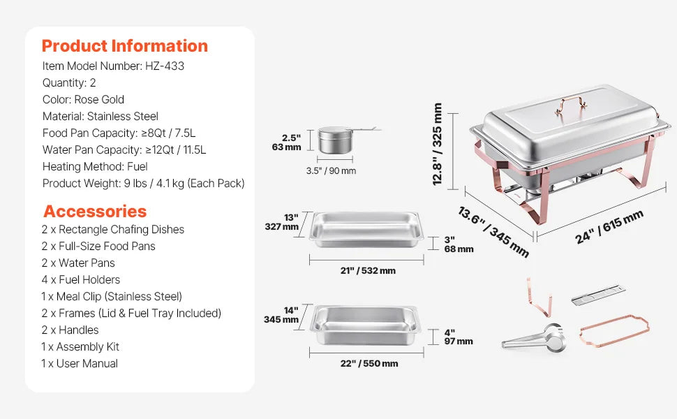 Featuring a generous 8-quart capacity, each chafer is perfect for buffets, weddings, and parties, allowing you to present a variety of dishes while maintaining optimal temperature. Crafted from high-quality stainless steel, these chafers are not only rust-resistant but also easy to clean, making them a practical choice for repeated use.