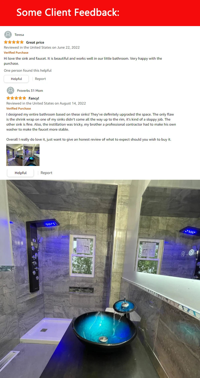 Elevate your bathroom with the ZAPPO tempered glass vessel sink in blue, paired with a sleek waterfall faucet. This contemporary sink blends a bold blue glass vessel with a calming waterfall flow for a striking focal point in any bathroom.